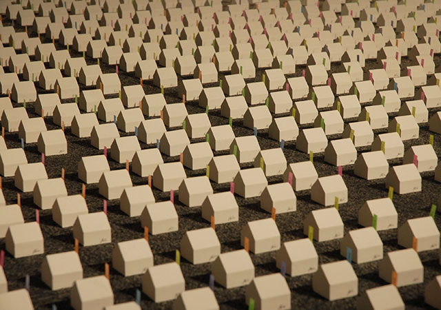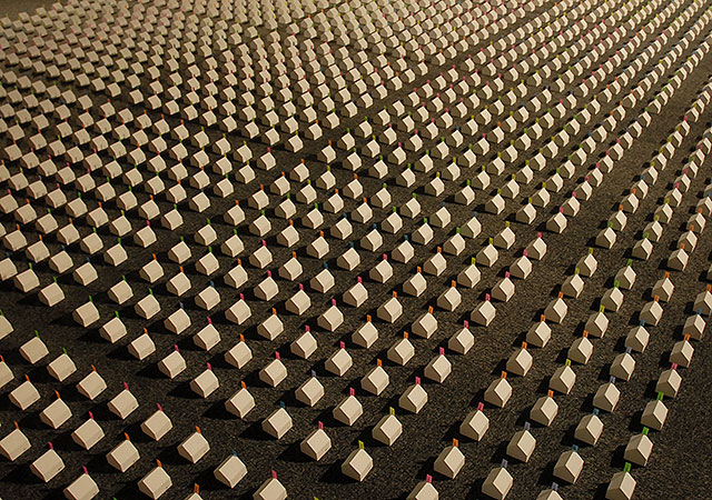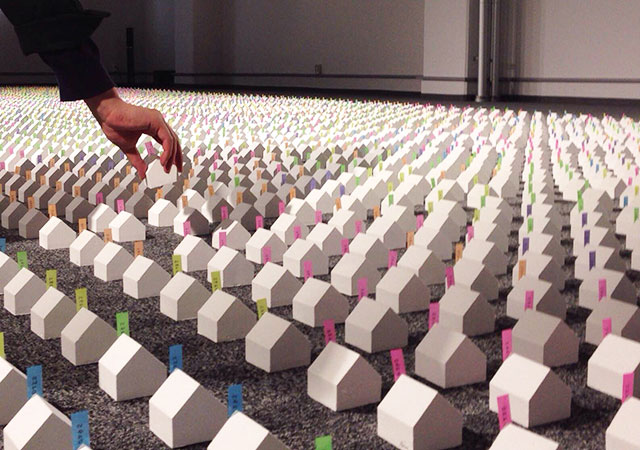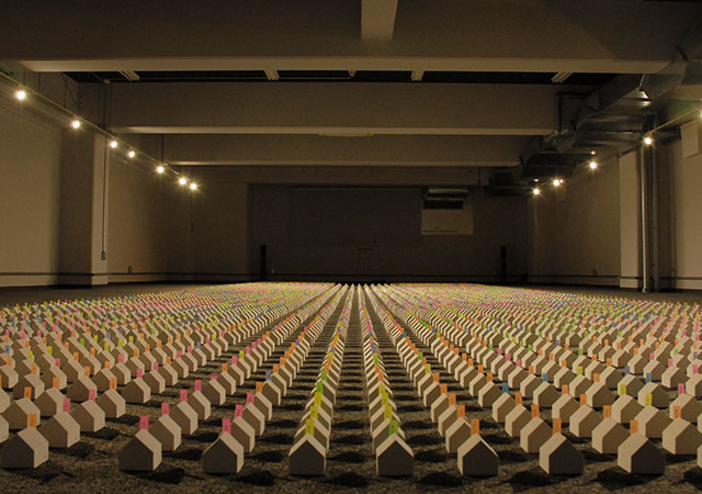 アートとメディアの領域を横断する「贈与」と「拡散」のインスタレーション。来場者はサインとシリアル番号の入った約4000個の作品を自由に持ち帰り、その写真をインターネット上に載せていくことができる。作品が持ち出されることによって鑑賞がギャラリー内で完結せず外部へと拡散し、ネットワークの中にデータとして広がっていく状況を形にすることで、アートや都市を再考するための場を目指した。展示された作品は徐々にその秩序を乱し減退し消滅へと向かう。また集音マイクによって出力され続けるリアルタイムの”大気やインフラの音”が身の周りに横たわる無意識下の空間を知覚させるであろう。